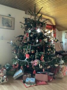 Granen är dekorerad och något sned. Hoppas att den inte välter!